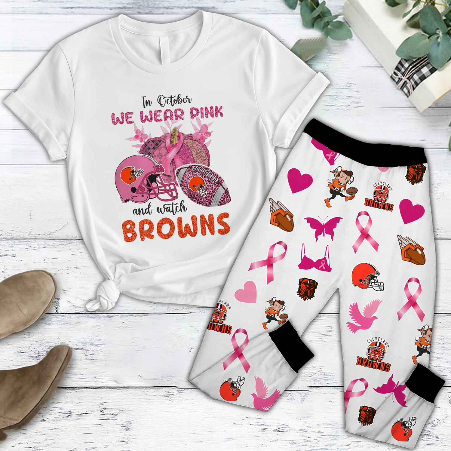 In October We Wear Pink And Watch CLE NFL Pajamas Set DatND DVT