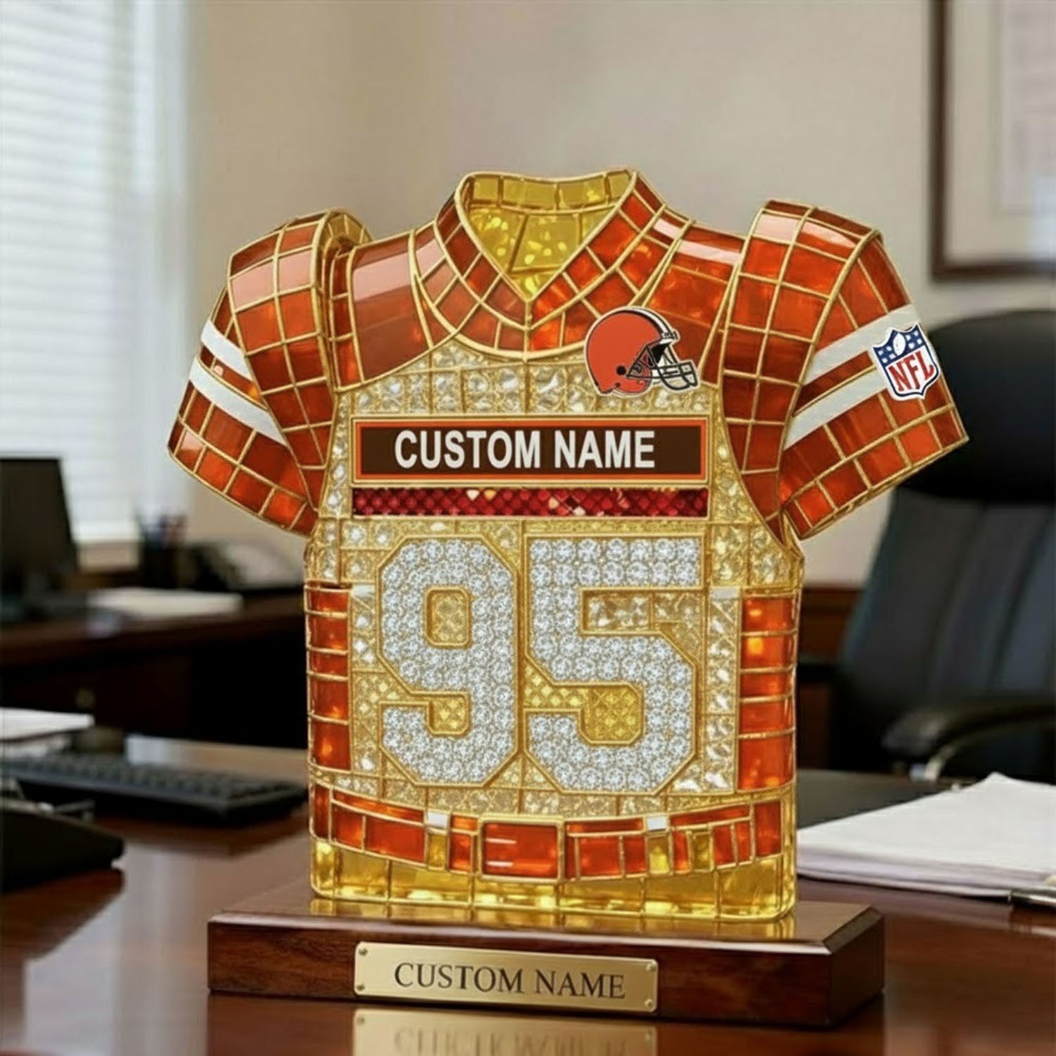 Crafted from high-quality acrylic ƒ?? perfect for decoration, collection, or gifting to any true Cleveland fan - This personalized NFL logo themed colored crystal figurine symbolizes strength and freedom, perfectly capturing the majestic scene of an eagle soaring through the sky. With its piercing gaze and resolute stance, the eagle represents courage and strength. Whether displayed on a desk, in the office, or as a special gift, it creates a striking visual element, inspiring strength and inspiration.